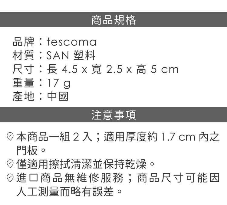 品牌:tescoma材質:SAN 塑料尺寸:長 4.5 x 寬 2.5 x 高 5 cm重量:17 g產地:中國