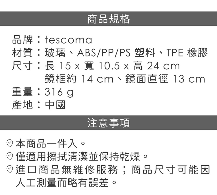 品牌:tescoma材質:玻璃、ABS/PP/PS 塑料、TPE 橡膠尺寸:長 15 x 寬 10.5 x 高 24 cm;鏡框約 14 cm、鏡面直徑 13 cm重量:316 g產地:中國
