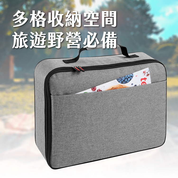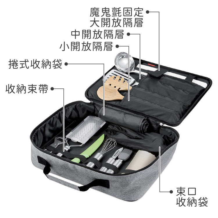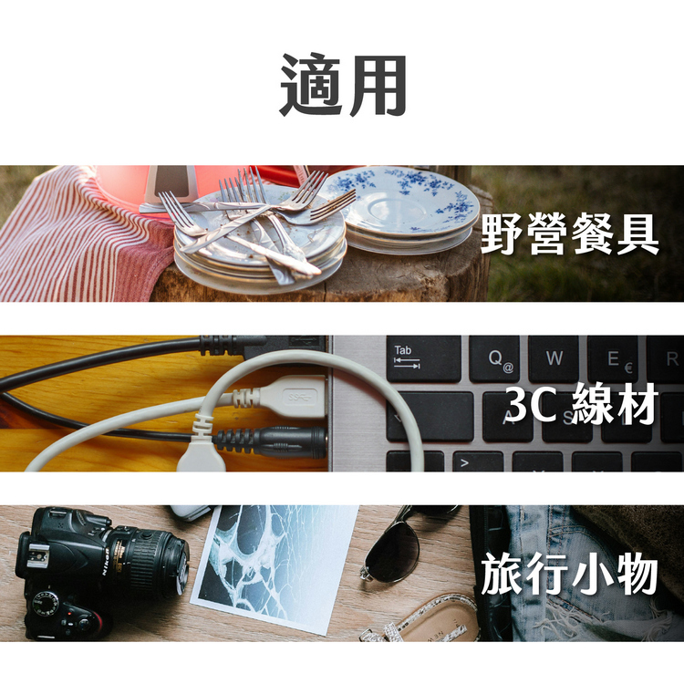 尺寸:平放時長 39 x 寬 29.3 x 高 9 cm;包外隔層長 37.3 x 寬 22 cm;收納束帶大格長 9 cm、小格長 5.3 cm;大開放隔層長 37 x 寬 21.7 cm;中開放隔層長 21 x 寬 23 cm;小開放隔層單格長 5.5 x 寬 21 cm;捲式收納袋展開時長 40.5 x 寬 34 cm、捲起後長 18 x 寬 5.5 x 高 4 cm;束口收納袋長 24 x 寬 12.5 x 高 0.1 cm