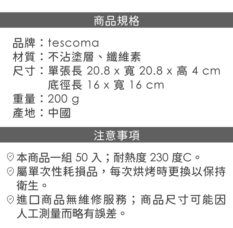 品牌:tescoma材質:不沾塗層、纖維素尺寸:單張長 20.8 x 寬 20.8 x 高 4 cm;底徑長 16 x 寬 16 cm重量:200 g產地:中國