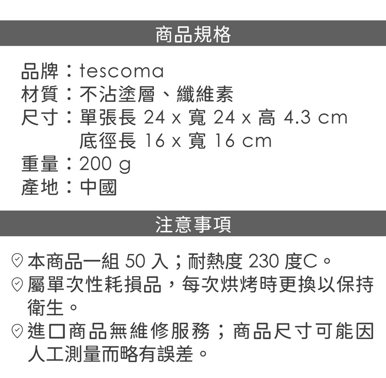 品牌:tescoma材質:不沾塗層、纖維素尺寸:單張長 24 x 寬 24 x 高 4.3 cm;底徑長 16 x 寬 16 cm重量:200 g產地:中國