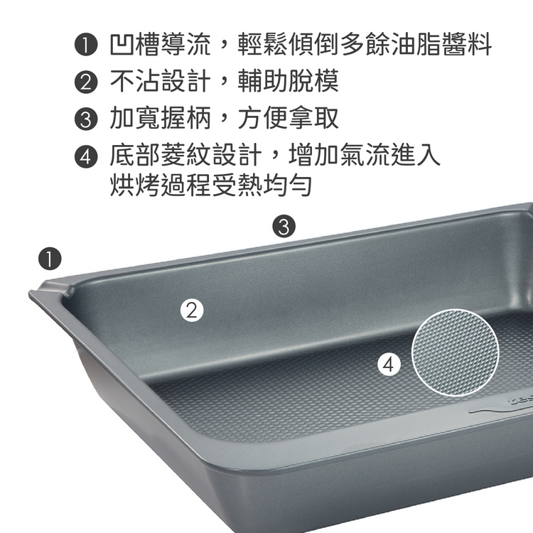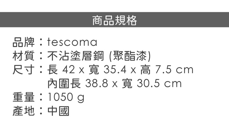 品牌:tescoma材質:不沾塗層鋼 (聚酯漆)尺寸:長 42 x 寬 35.4 x 高 7.5 cm;內圍長 38.8 x 寬 30.5 cm重量:1050 g產地:中國