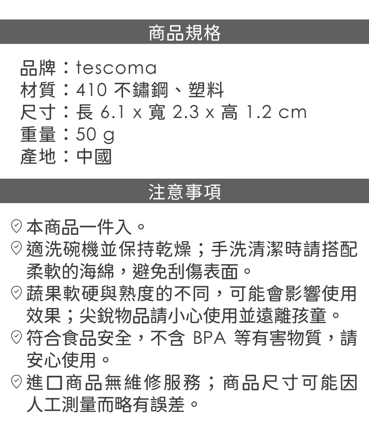 品牌:tescoma材質:410 不鏽鋼、塑料尺寸:長 6.1 x 寬 2.3 x 高 1.2 cm重量:50 g產地:中國