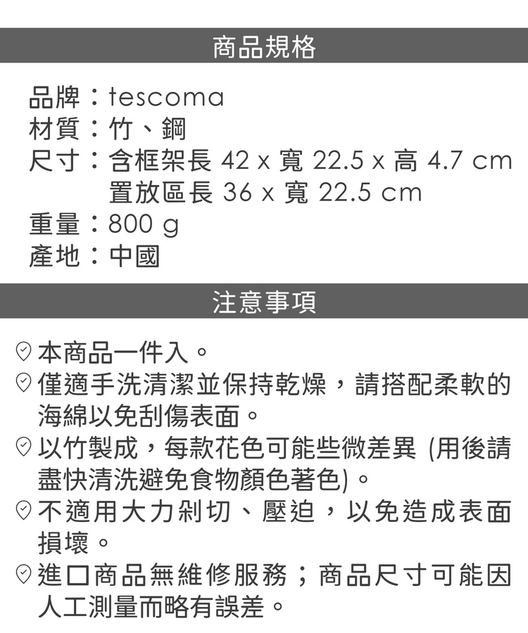 品牌:tescoma材質:竹、鋼尺寸:含框架長 42 x 寬 22.5 x 高 4.7 cm;置放區長 36 x 寬 22.5 cm重量:800 g產地:中國