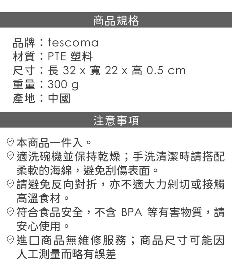 品牌:tescoma材質:PTE 塑料尺寸:長 32 x 寬 22 x 高 0.5 cm重量:300 g產地:中國