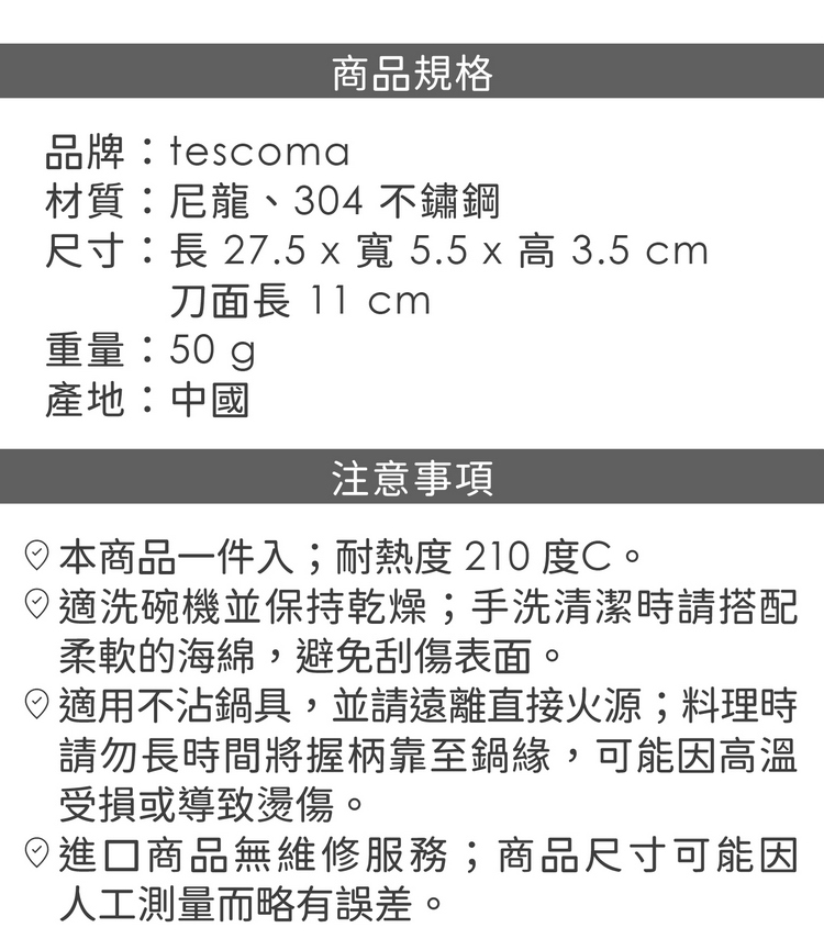 品牌:tescoma材質:尼龍、304 不鏽鋼尺寸:長 27.5 x 寬 5.5 x 高 3.5 cm;刀面長 11 cm重量:50 g產地:中國