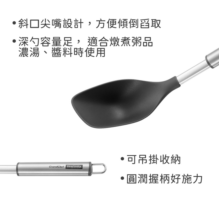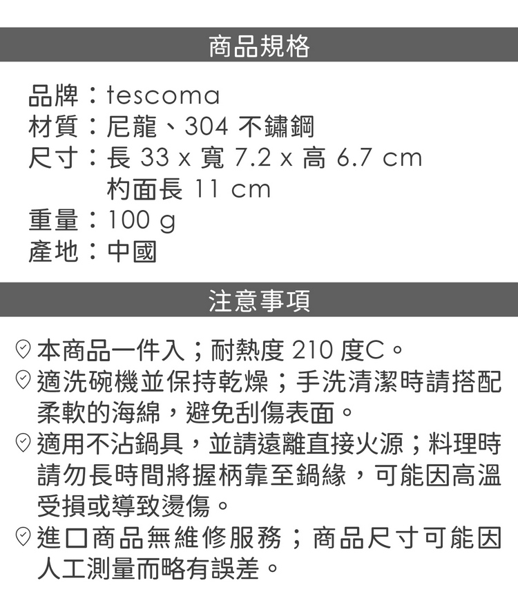 品牌:tescoma材質:尼龍、304 不鏽鋼尺寸:長 33 x 寬 7.2 x 高 6.7 cm、杓面長 11 cm重量:100 g產地:中國