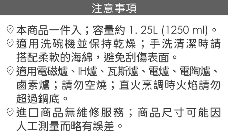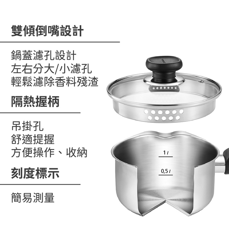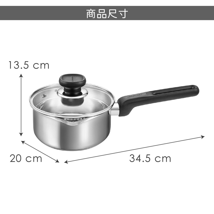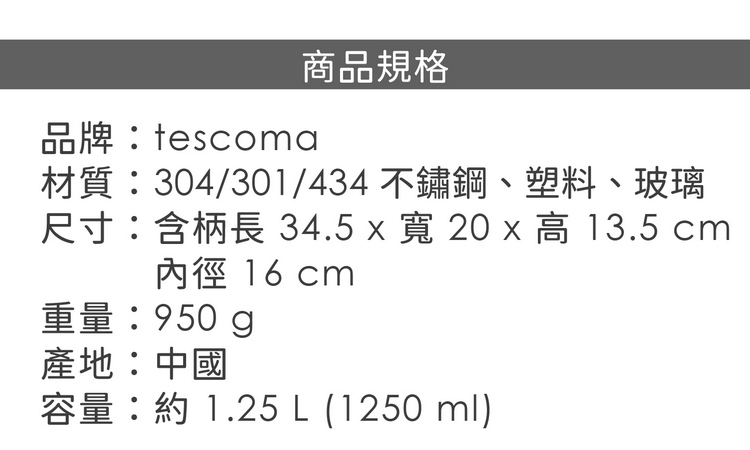 品牌:tescoma材質:304/301/434 不鏽鋼、塑料、玻璃尺寸:含柄長 34.5 x 寬 20 x 高 13.5 cm;內徑 16 cm 重量:950 g產地:中國容量:約 1.25 L (1250 ml)