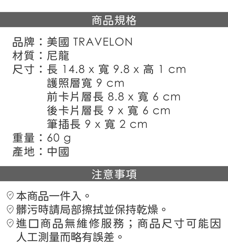 品牌:美國 TRAVELON材質:尼龍尺寸:長 14.8 x 寬 9.8 x 高 1 cm;護照層寬 9 cm、前卡片層長 8.8 x 寬 6 cm、後卡片層長 9 x 寬 6 cm、筆插長 9 x 寬 2 cm重量:60 g產地:中國