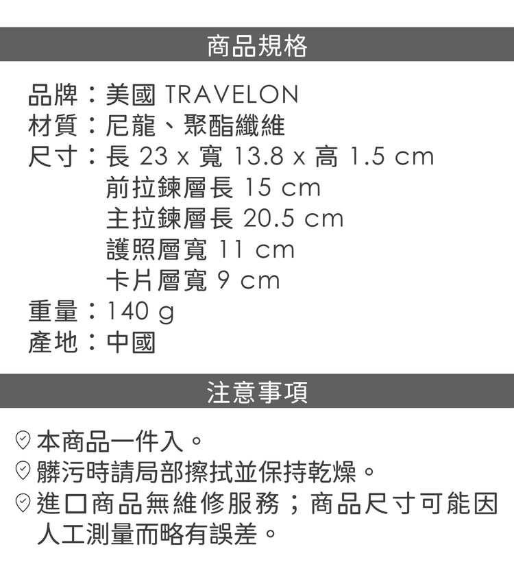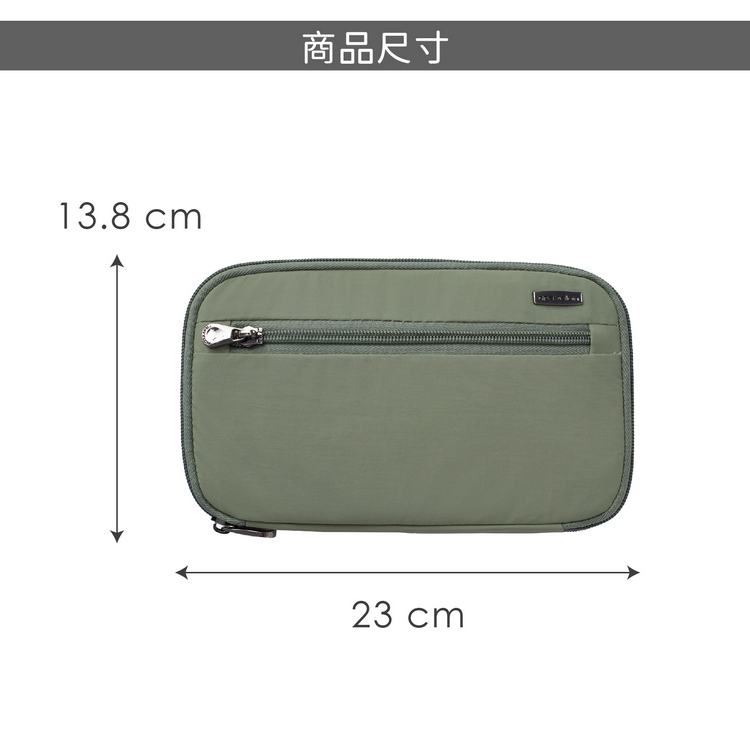尺寸:長 23 x 寬 13.8 x 高 1.5 cm;前拉鍊層長 15 cm、主拉鍊層長 20.5 cm、護照層寬 11 cm、卡片層寬 9 cm