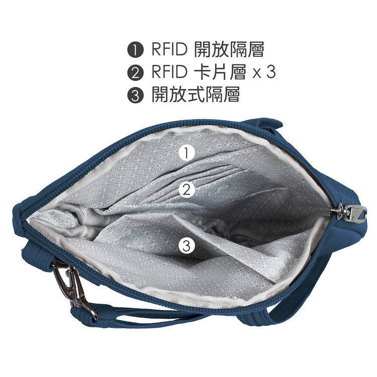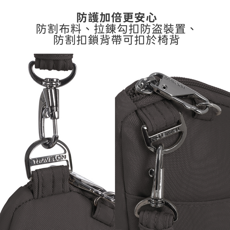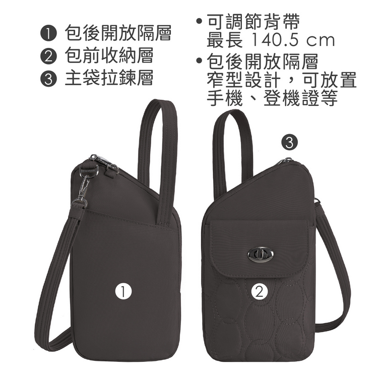 品牌:美國 TRAVELON材質:聚酯纖維、鋼線、尼龍、EPE 發泡性聚乙烯、EVA 塑料尺寸:包長 14.5 x 寬 5.5 x 高 25.5 cm;包前收納層長 13 cm、主袋拉鍊層長 14 cm、包後開放隔層長 13 cm;背帶最長 140.5 cm重量:230 g產地:中國