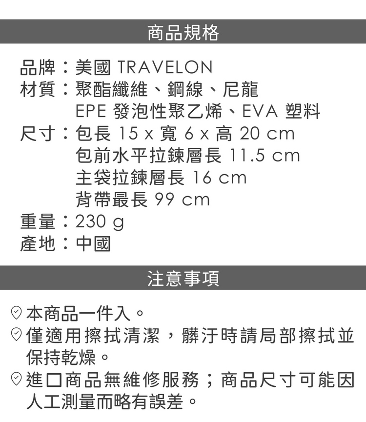 尺寸:包長 15 x 寬 6 x 高 20 cm;包前水平拉鍊層長 11.5 cm、主袋拉鍊層長 16 cm;背帶最長 99 cm