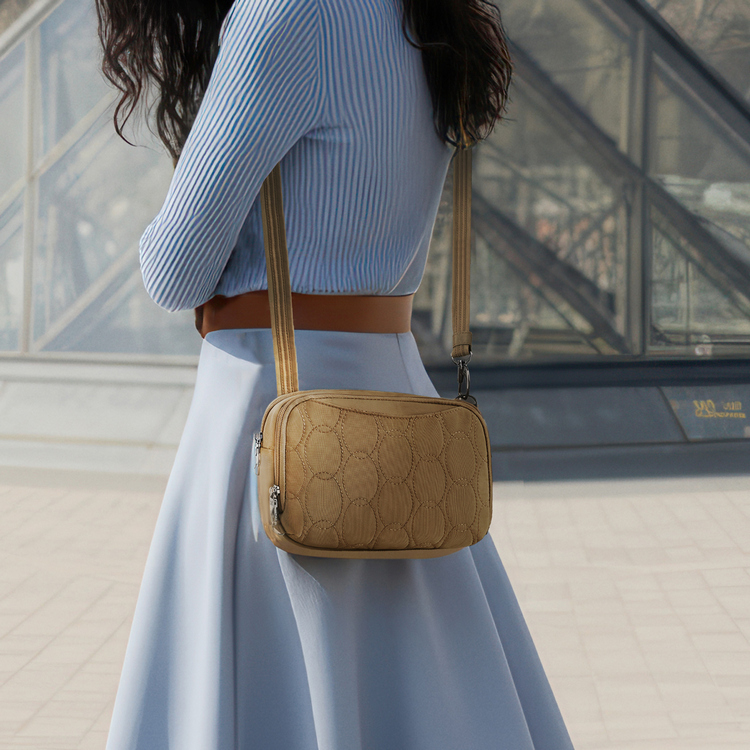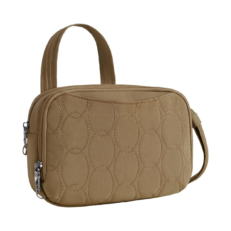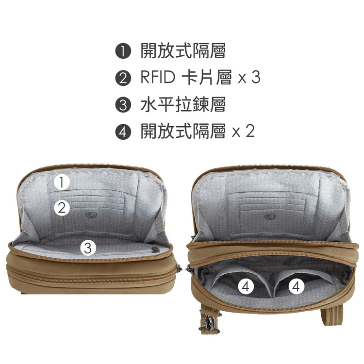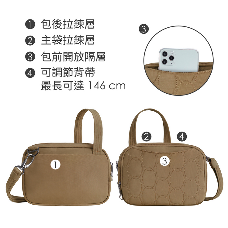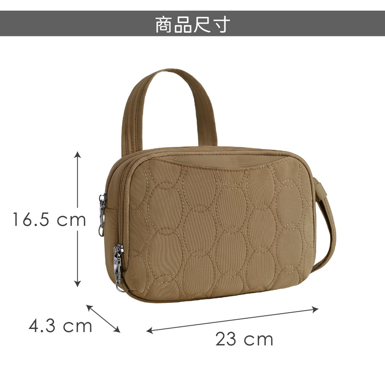 品牌:美國 TRAVELON材質:聚酯纖維、鋼線、尼龍、EPE 發泡性聚乙烯、EVA 塑料尺寸:包長 23 x 寬 4.3 x 高 16.5 cm;包前開放隔層長 15 cm、主袋拉鍊層長 22 cm、包後拉鍊層長 22 cm;背帶最長 146 cm重量:300 g產地:中國