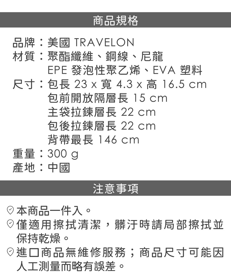 尺寸:包長 23 x 寬 4.3 x 高 16.5 cm;包前開放隔層長 15 cm、主袋拉鍊層長 22 cm、包後拉鍊層長 22 cm;背帶最長 146 cm