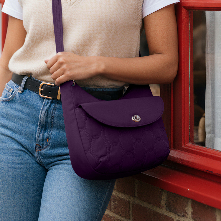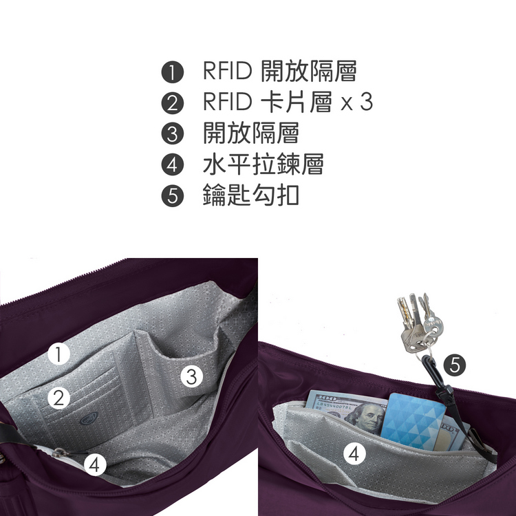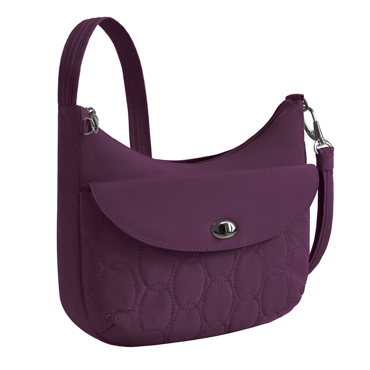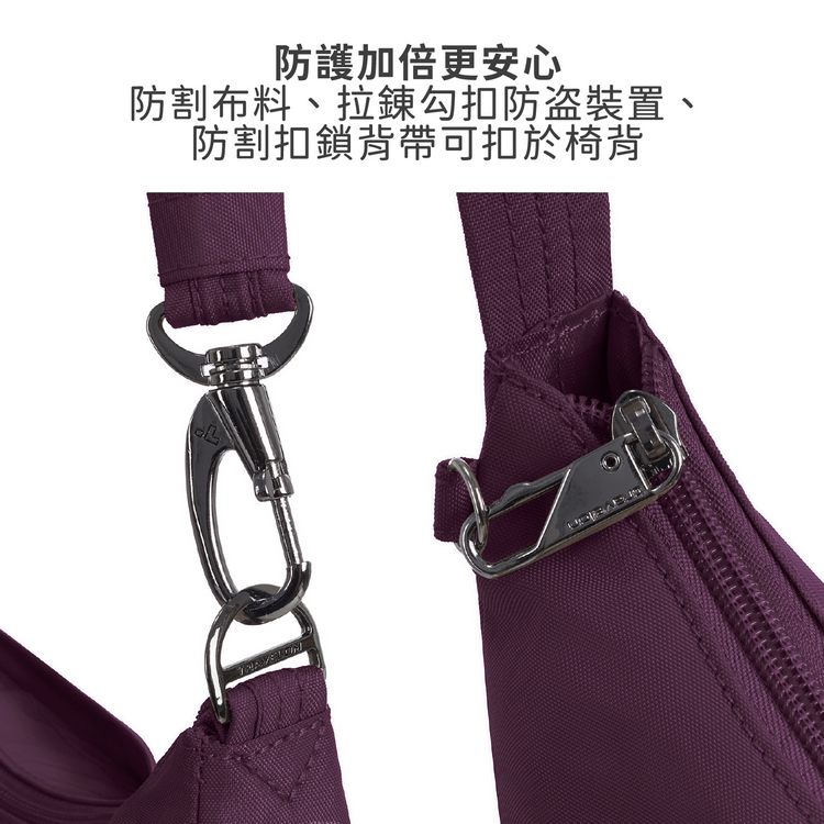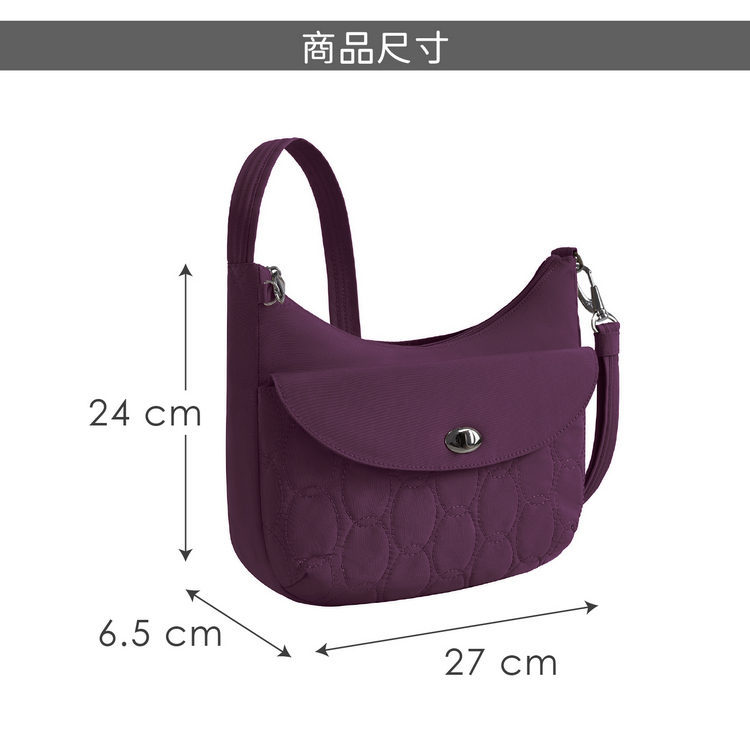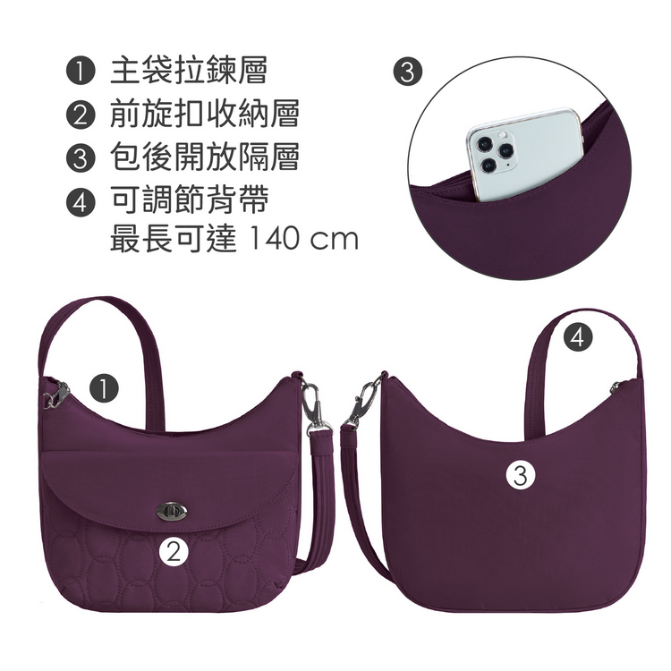 美國 TRAVELON - Runways 3層防盜斜背旋鈕彎月包(黑莓紫)