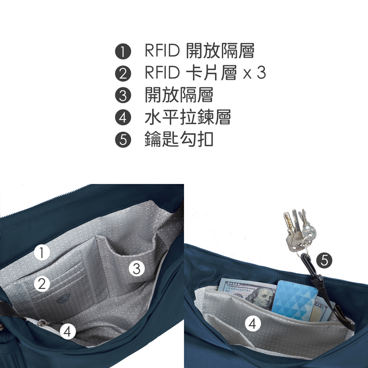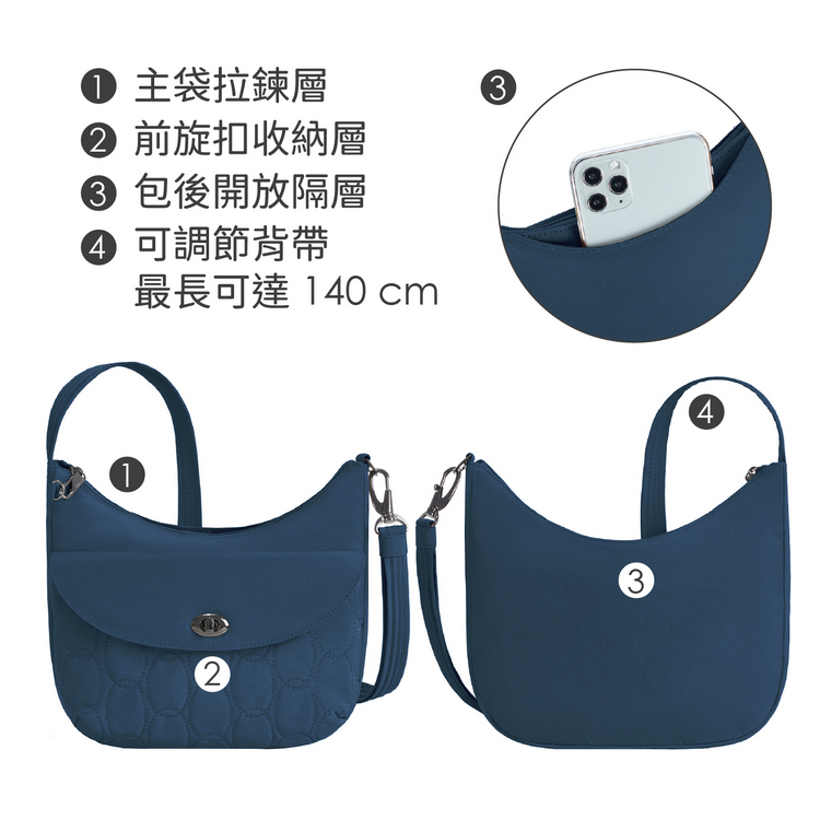 美國 TRAVELON - Runways 3層防盜斜背旋鈕彎月包(海軍藍)