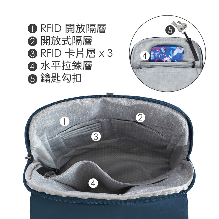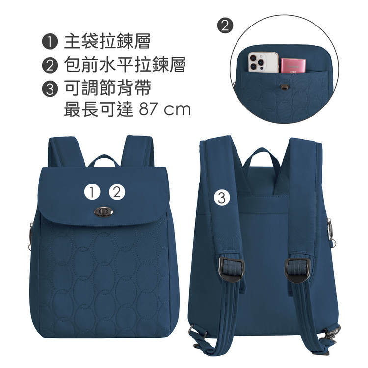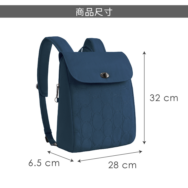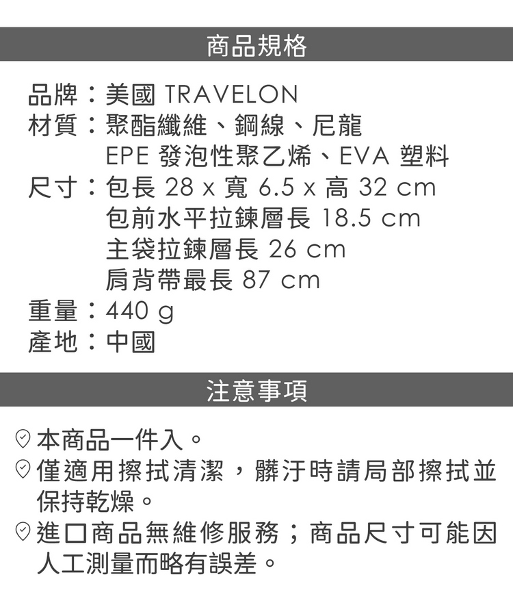 品牌:美國 TRAVELON材質:聚酯纖維、鋼線、尼龍、EPE 發泡性聚乙烯、EVA 塑料尺寸:包長 28 x 寬 6.5 x 高 32 cm;包前水平拉鍊層長 18.5 cm、主袋拉鍊層長 26 cm;肩背帶最長 87 cm重量:440 g產地:中國