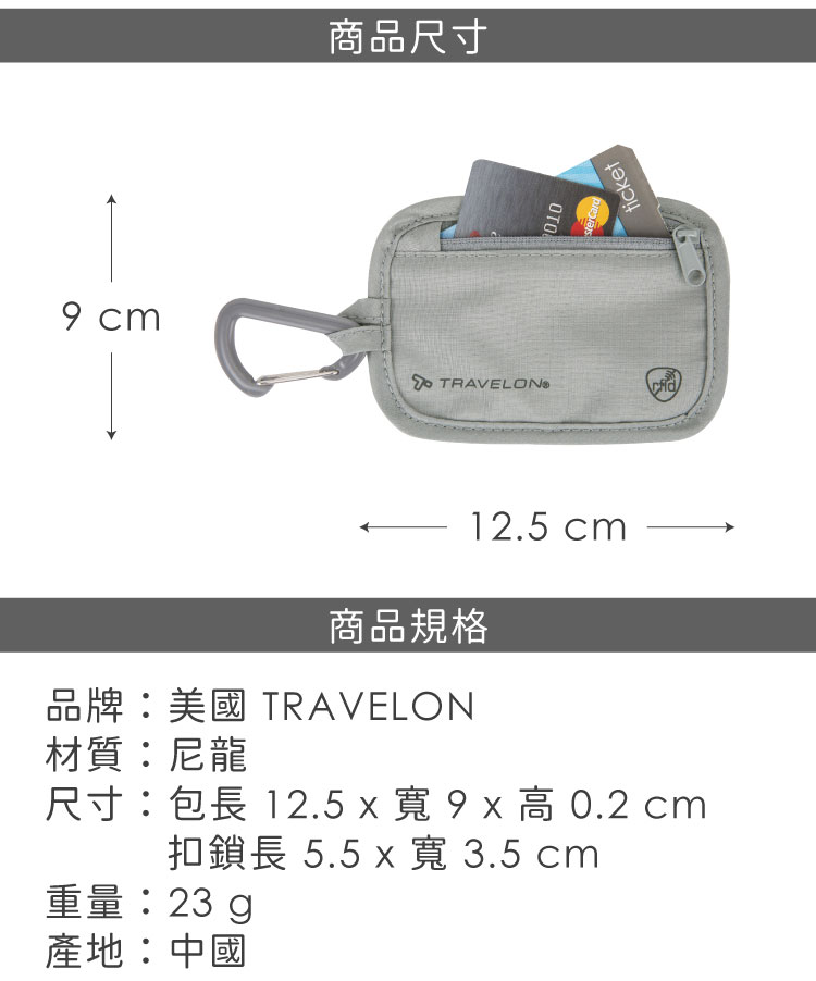 品牌:美國 TRAVELON材質:尼龍尺寸:包長 12.5 x 寬 9 x 高 0.2 cm;扣鎖長 5.6 x 寬 3.5 cm重量:23 g產地:中國備註:進口商品無維修服務;商品尺寸可能因人工測量而略有誤差
