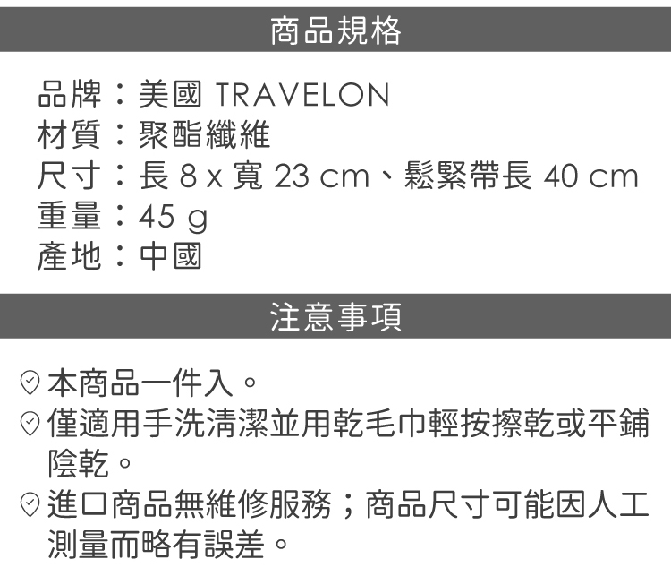 品牌:美國 TRAVELON材質:聚酯纖維尺寸:長 8 x 寬 23 cm、鬆緊帶長 40 cm重量:45 g產地:中國備註:進口商品無維修服務;商品尺寸可能因人工測量而略有誤差