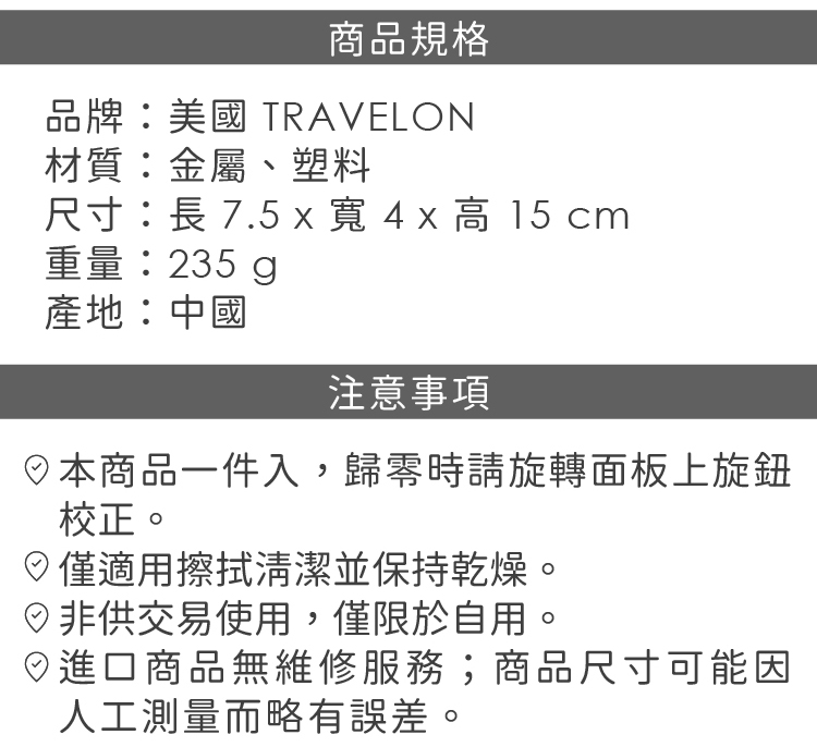 品牌:美國 TRAVELON 材質:金屬、塑料 尺寸:長 7.5 x 寬 4 x 高 15 cm 重量:235 g 產地:中國