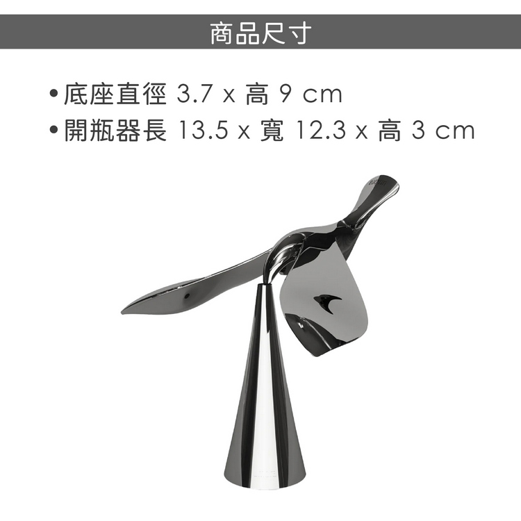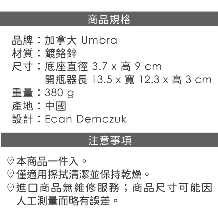品牌:加拿大 Umbra材質:鍍鉻鋅尺寸:底座直徑 3.7 x 高 9 cm、開瓶器長 13.5 x 寬 12.3 x 高 3 cm重量:380 g產地:中國設計:Ecan Demczuk
