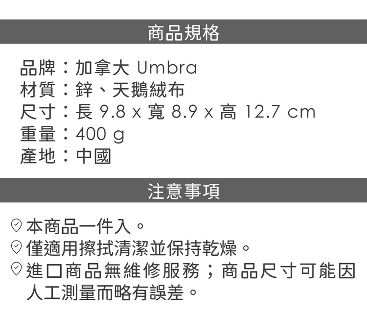品牌:加拿大 Umbra材質:鋅、天鵝絨布尺寸:長 9.8 x 寬 8.9 x 高 12.7 cm重量:400 g產地:中國