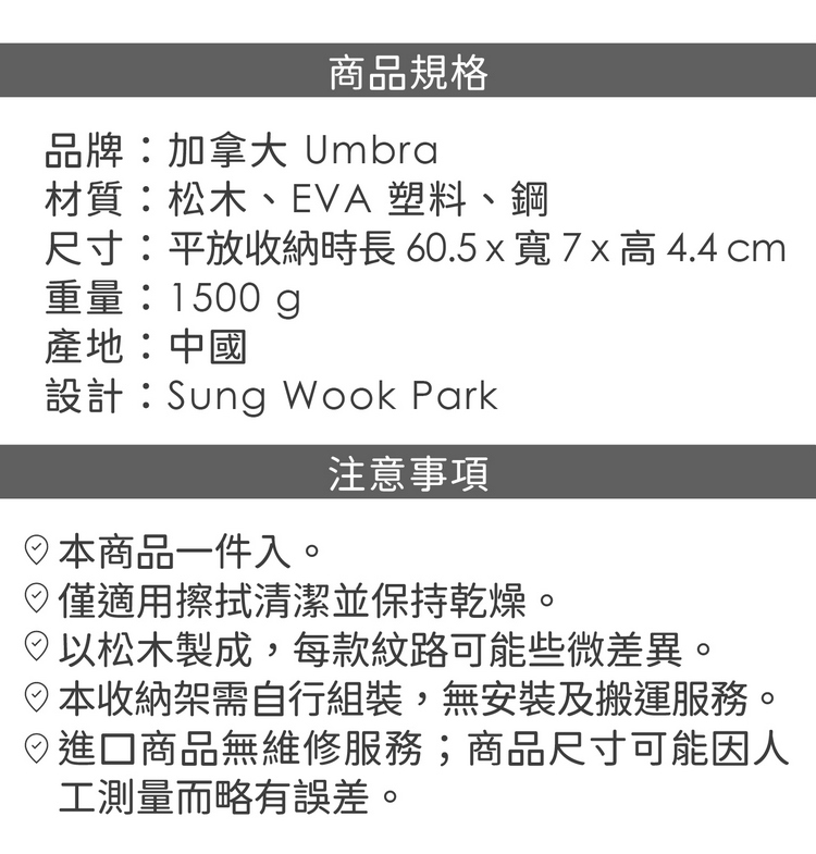 品牌:加拿大 Umbra材質:松木、EVA 塑料、鋼尺寸:平放收納時長 60.5 x 寬 7 x 高 4.4 cm重量:1500 g產地:中國設計:Sung Wook Park