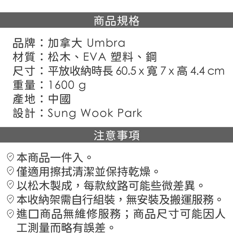 品牌:加拿大 Umbra材質:松木、EVA 塑料、鋼尺寸:平放收納時長 60.5 x 寬 7 x 高 4.4 cm重量:1600 g產地:中國設計:Sung Wook Park