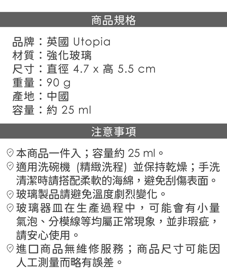 品牌:英國 Utopia材質:強化玻璃尺寸:直徑 4.7 x 高 5.5 cm重量:90 g產地:中國容量:約 25 ml