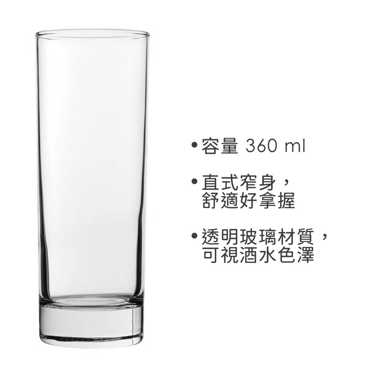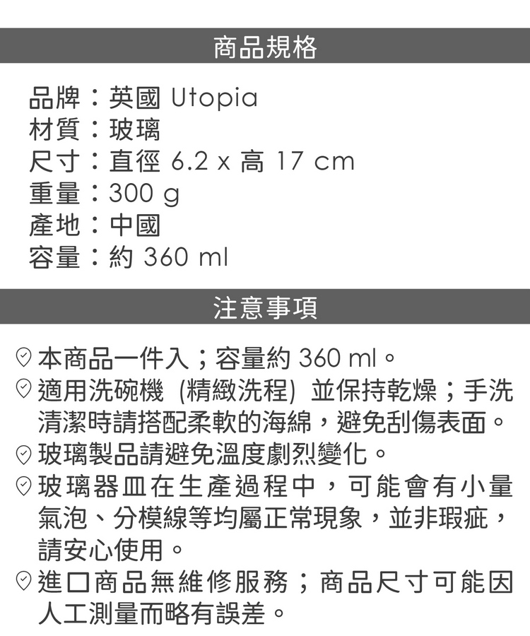 品牌:英國 Utopia材質:玻璃尺寸:直徑 6.2 x 高 17 cm重量:300 g產地:中國容量:約 360 ml