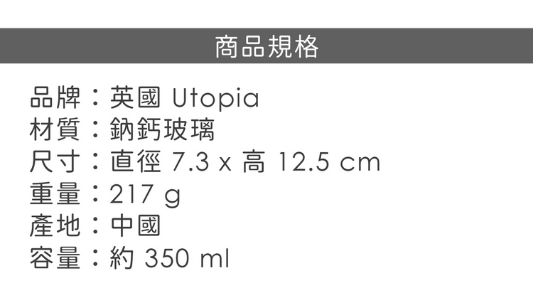 品牌:英國 Utopia材質:鈉鈣玻璃尺寸:直徑 7.3 x 高 12.5 cm重量:220 g產地:中國容量:約 350 ml