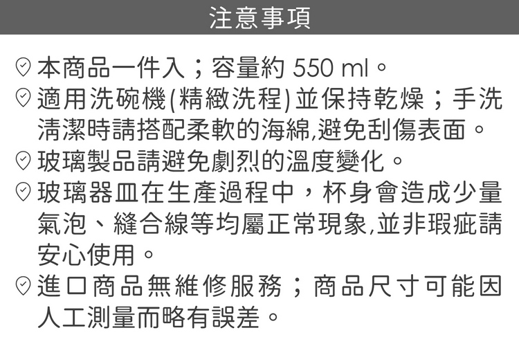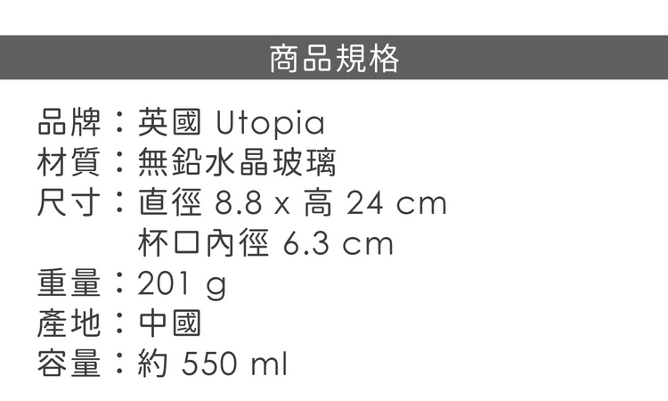 品牌:英國 Utopia材質:無鉛水晶玻璃尺寸:直徑 8.8 x 高 24 cm;杯口內徑 6.3 cm重量:210 g產地:中國容量:約 550 ml