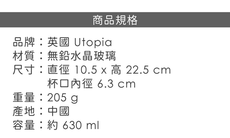 品牌:英國 Utopia材質:無鉛水晶玻璃尺寸:直徑 10.5 x 高 22.5 cm;杯口內徑 6.3 cm重量:210 g產地:中國容量:約 630 ml