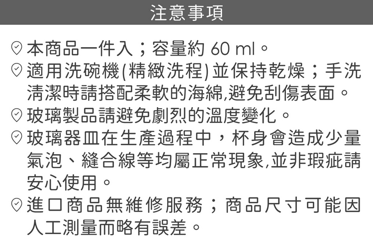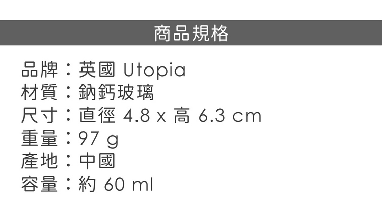 品牌:英國 Utopia材質:鈉鈣玻璃尺寸:直徑 4.8 x 高 6.3 cm重量:100 g產地:中國容量:約 60 ml