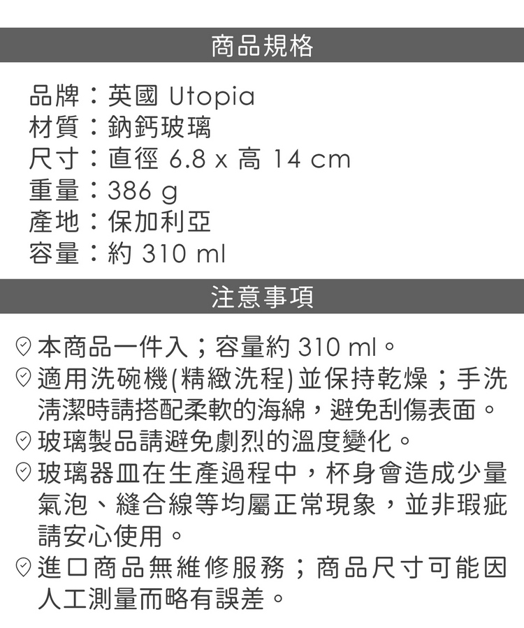 品牌:英國 Utopia材質:鈉鈣玻璃尺寸:直徑 6.8 x 高 14 cm重量:390 g產地:保加利亞容量:約 310 ml