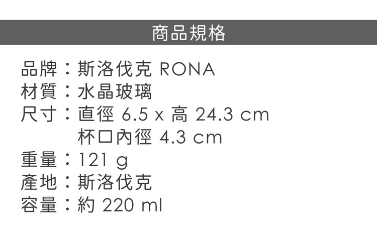 品牌:斯洛伐克 RONA材質:水晶玻璃尺寸:直徑 6.5 x 高 24.3 cm;杯口內徑 4.3 cm重量:180 g產地:斯洛伐克容量:約 220 ml