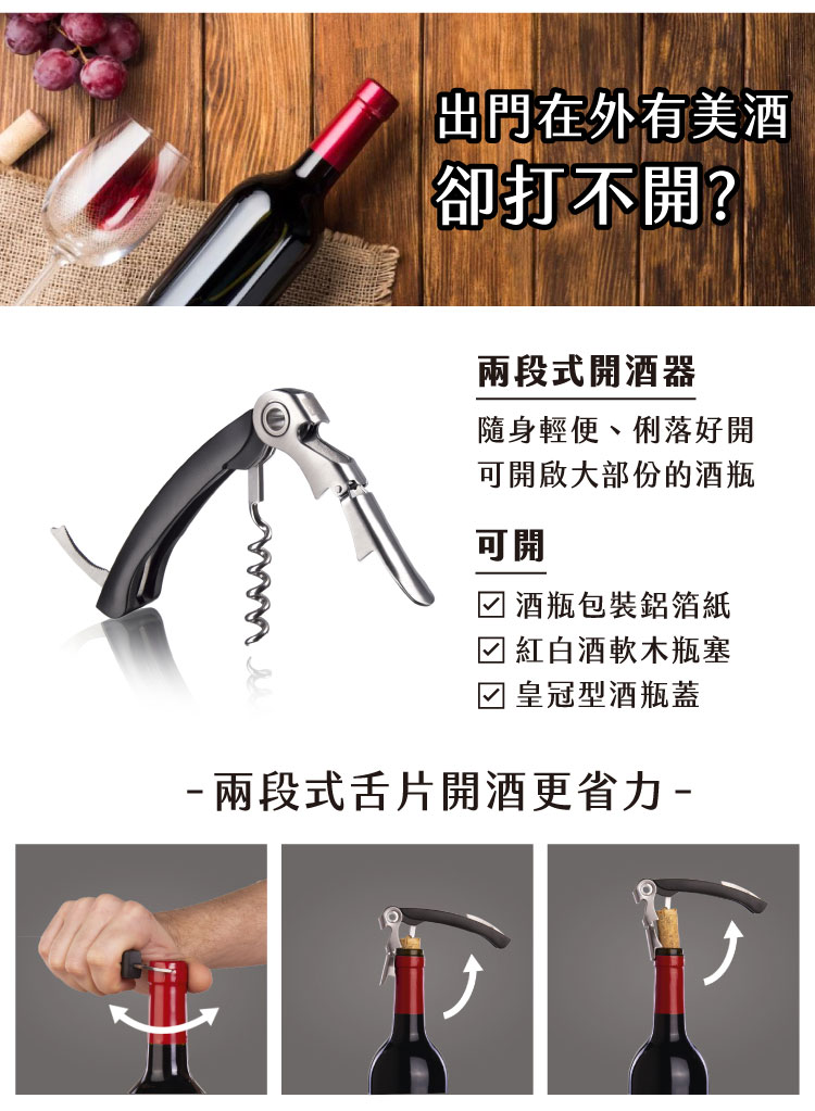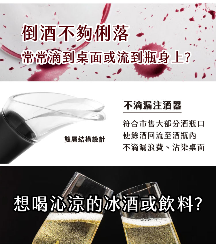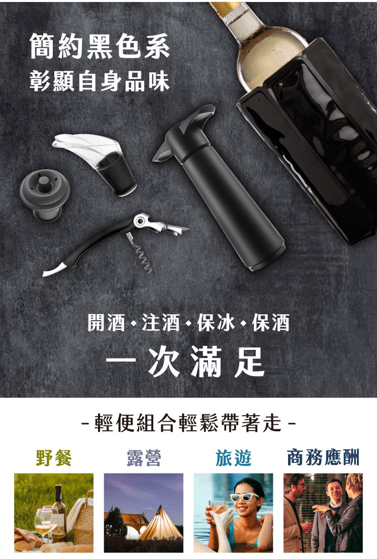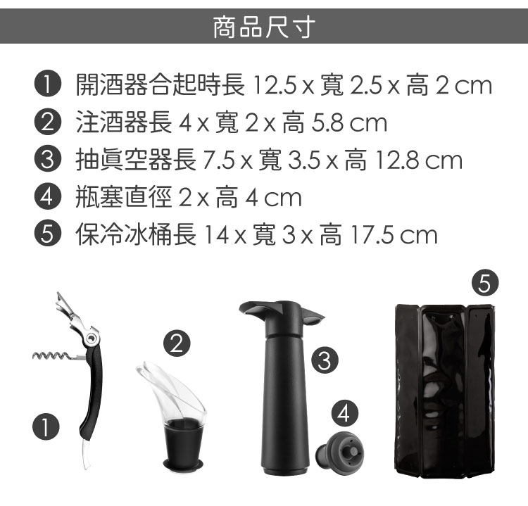 尺寸:開酒器合起時長 12.5 x 寬 2.5 x 高 2 cm、注酒器長 3.5 x 寬 3.3 x 高 6.5 cm、抽真空器長 7.3 x 寬 3 x 高 12.8 cm、瓶塞直徑 3.2 x 高 4.2 cm、保冷冰桶長 14 x 寬 3 x 高 17.5 cm (最大內徑 7.5 cm)