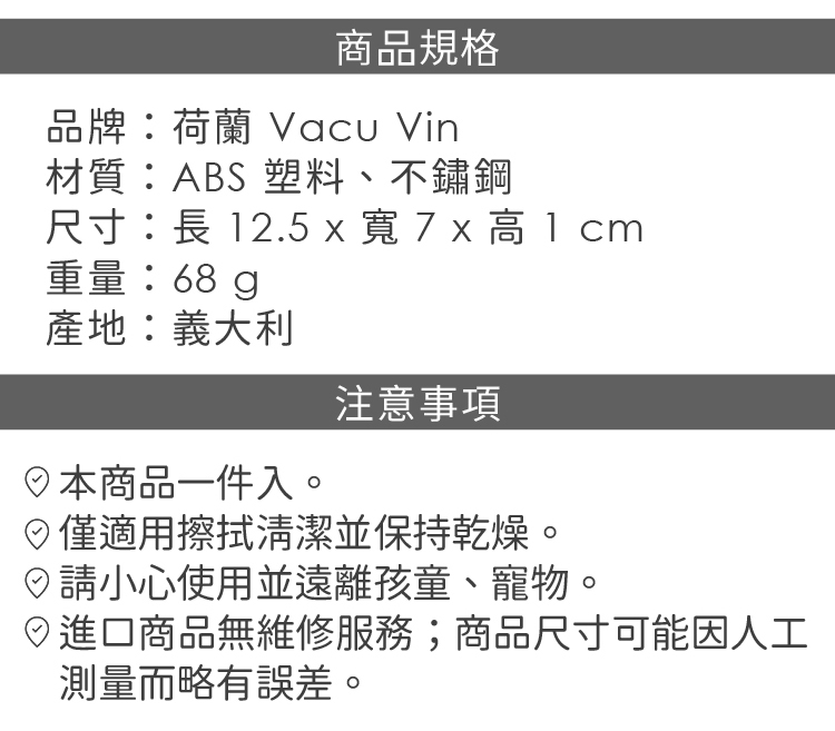 品牌:荷蘭 Vacu Vin材質:ABS 塑料、不鏽鋼尺寸:長 12.5 x 寬 7 x 高 1 cm重量:68 g產地:義大利備註:進口商品無維修服務;商品尺寸可能因人工測量而略有誤差