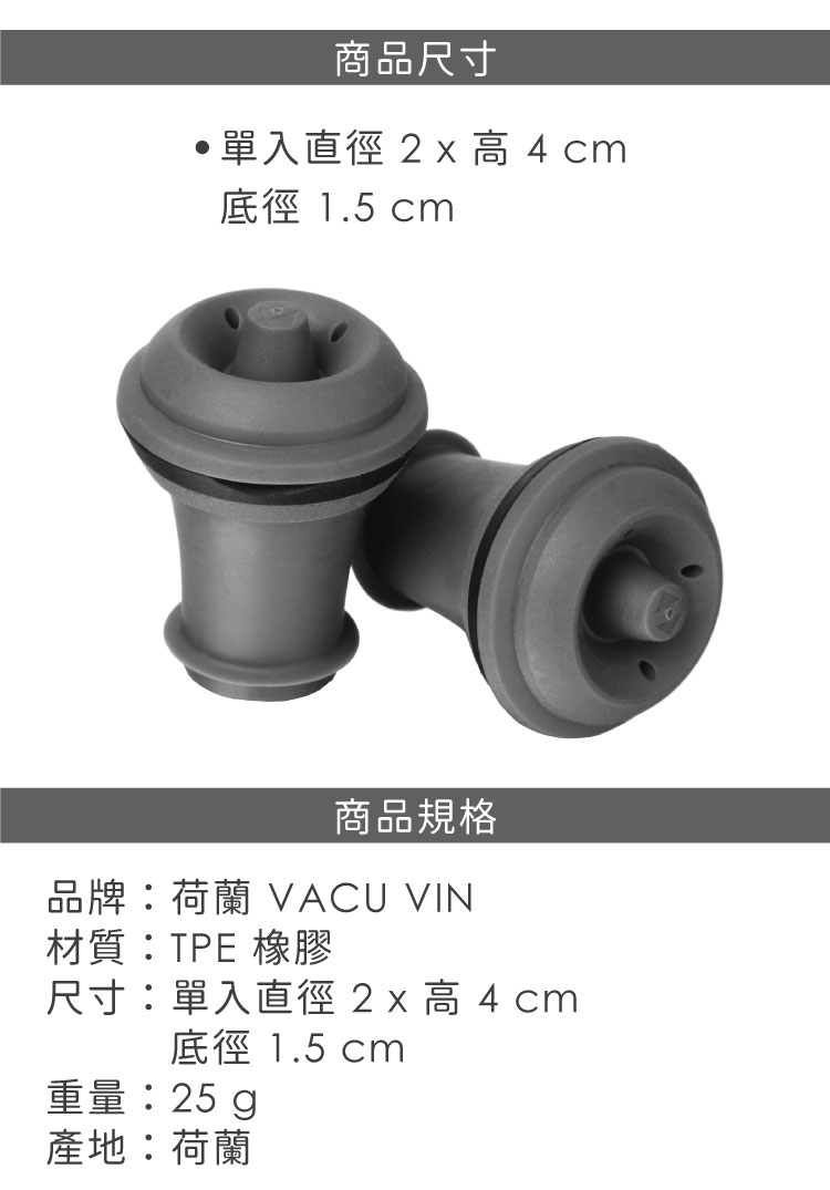 品牌:荷蘭 Vacu Vin材質:TPE 塑料尺寸:直徑 2 x 高 4 cm、底徑 1.5 cm重量:24 g產地:波蘭備註:進口商品無維修服務;商品尺寸可能因人工測量而略有誤差