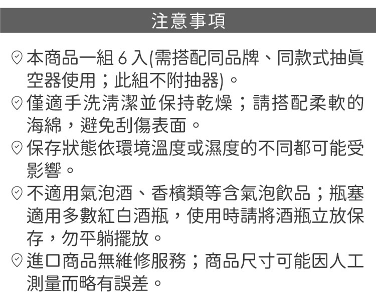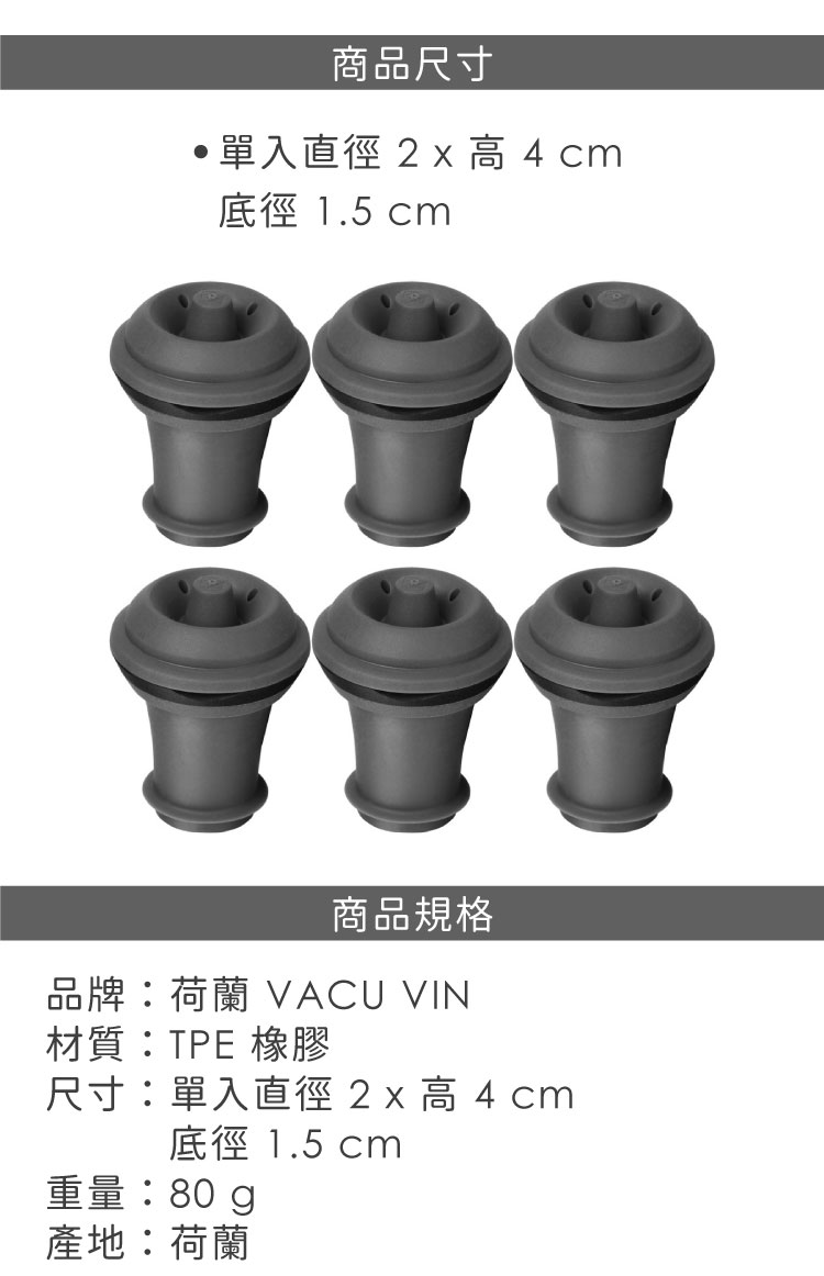 品牌:荷蘭 Vacu Vin材質:TPE 塑料尺寸:直徑 2 x 高 4 cm重量:80 g產地:波蘭備註:進口商品無維修服務;商品尺寸可能因人工測量而略有誤差